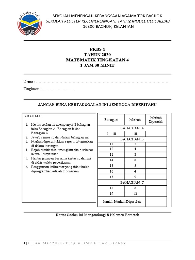 Ujian 1 Matematik Tingkatan 4 2020 Pdf